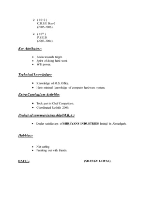 Shanky Goyal is seeking to implement creative ideas through challenging career opportunities involving teamwork and innovation. He has studied commerce, earning a B.Com from Arya College in Ludhiana in 2009 and is currently pursuing an MBA from Punjab College of Technical Education. His skills include proficiency with Microsoft Office, computer hardware knowledge, and coordinating events. He has experience with market research and enjoys internet use and socializing.