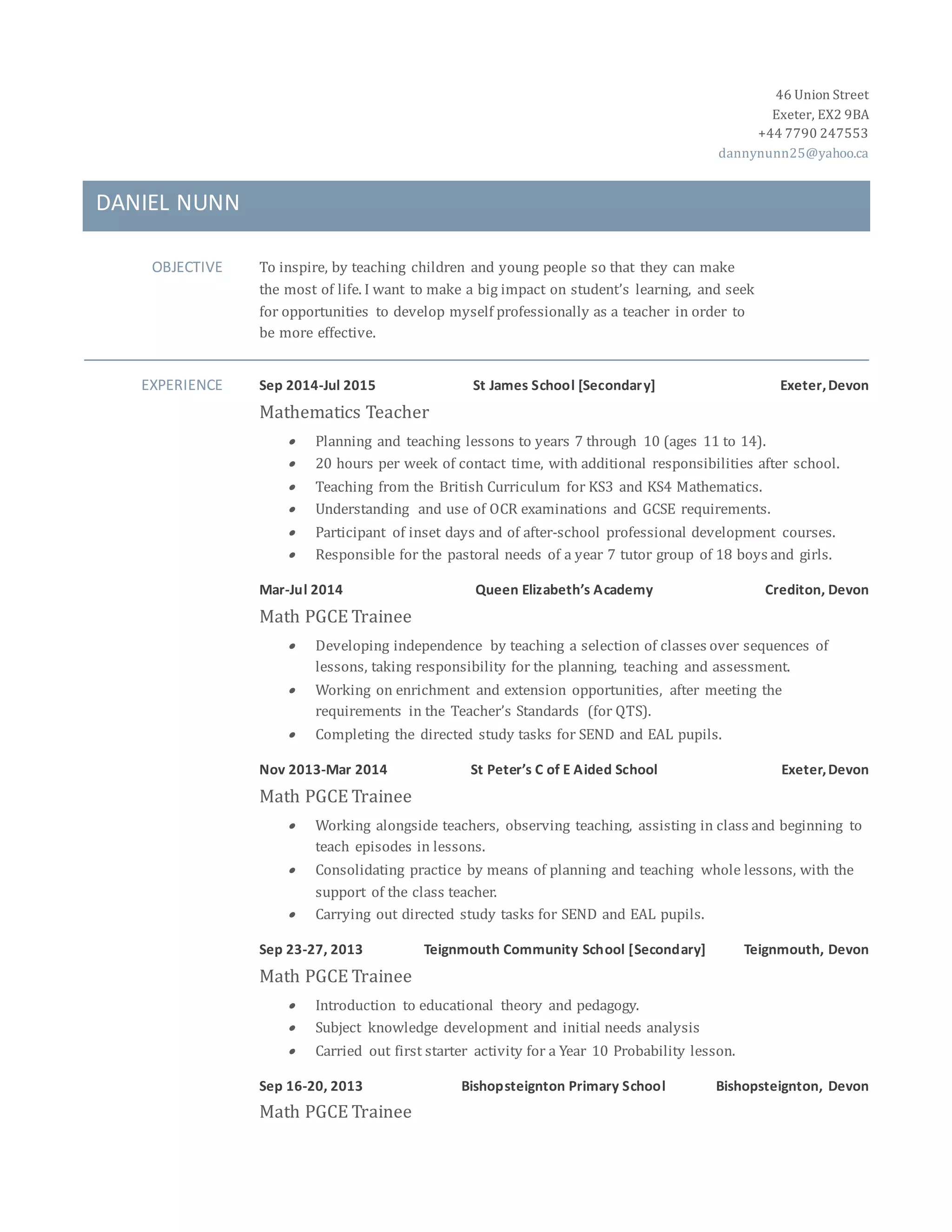 Daniel Nunn is seeking a teaching position and has experience teaching mathematics at various levels in both the UK and Canada. He has a Bachelor's degree in Civil Engineering from the University of Windsor and a PGCE in Secondary Mathematics from the University of Exeter, and is looking to inspire students and make a positive impact on their learning. His resume outlines his educational background and details his work experience in both engineering and teaching roles.