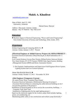 Malek Khudirat is a Jordanian electrical engineer with over 10 years of experience in electrical design and site engineering. He has a bachelor's degree in electrical engineering from Jordan University of Science and Technology. His experiences include working as an electrical engineer for several companies in Jordan, where he performed tasks such as electrical schematic design, site implementation and supervision, quantity take-offs, and maintaining safety. He also has several technical certifications in areas like lighting design, electrical safety, PLC programming, and technical writing.