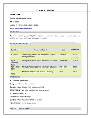 Imran Khan is seeking a challenging position where he can utilize his abilities. He has a B. Pharma degree from Dr. Hari Singh Gour Central University with 80.5% marks. He has over 2 years of work experience as a Medical Representative and Territory Manager for Synchem Pharma Lab and Medley Pharma Ltd respectively. He has presented posters at several national and international conferences on topics related to drug delivery and targeting. He is honest, stable, and confident with strengths in working under pressure and adapting to challenges.