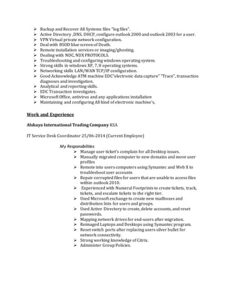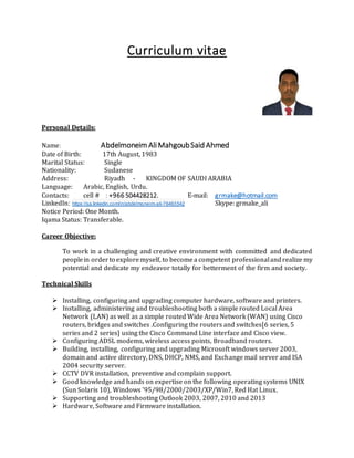 This document is a curriculum vitae for Abdelmoneim AliMahgoubSaid Ahmed that includes his personal details, career objective, technical skills, work experience, and education. It outlines his experience as an IT Service Desk Coordinator for Alshaya International Trading Company where he manages user tickets and provides IT support. It also details his previous roles providing IT support for Aljazeera Hospital and Zoal Tech, and lists his technical skills and qualifications, including degrees from Osmania University and Western Kurdfan University.