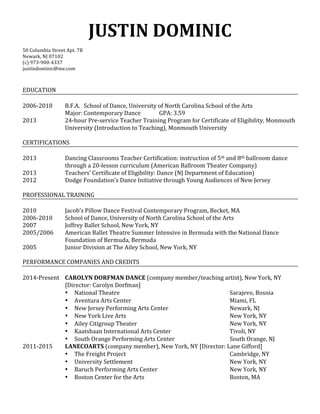 This document is Justin Dominic's curriculum vitae. It outlines his education, certifications, professional training, and extensive performance experience as a dancer and teaching artist with numerous dance companies from 2010 to present. He holds a BFA in Contemporary Dance and state certifications to teach dance. His CV demonstrates a career focused on performing internationally with established choreographers and companies as well as teaching dance.