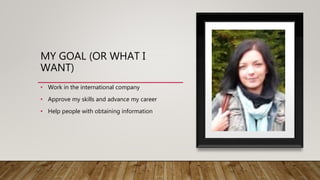 Viktoriya Yasinska is seeking a job in an international company where she can improve her skills and advance her career helping people obtain information. She has experience as a news reporter, TV program author and director, and press secretary where she demonstrated strong analytical, organizational, and communication skills. Viktoriya has skills in information searching, analysis, presentation, clear messaging, and working under deadlines. She is fluent in Russian and advanced in English and proficient in Microsoft Office programs.