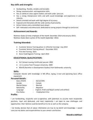 The document is a curriculum vitae for Mandira Adhikari. It outlines her professional experience as a cashier and sales consultant for Waitrose Supermarket in Dubai from 2014 to present, and previously as a sales and marketing assistant for Shivapuri Saving and Credit Co-operative in Nepal. It also lists her education qualifications, skills, training, achievements and personal details. The objective is to seek a career opportunity that allows professional growth in her field of experience.