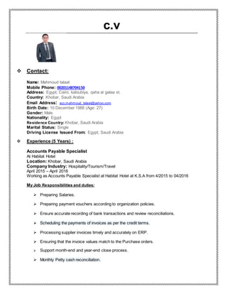 This document is a CV for Mahmoud Talaat, a 27-year-old Egyptian accountant currently residing in Saudi Arabia. It outlines his 5 years of experience working in accounts payable and credit control roles for hotels and other industries in Saudi Arabia and Qatar. It also provides details of his bachelor's degree in accounting from Benha University in Egypt and his skills in accounting software and languages. Contact information, employment history, responsibilities, education, skills and a reference are included.