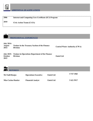 Rivancee Appunah has experience in econometrics, financial modeling, forecasting, and banking. She has knowledge of offshore banking, taxation agreements, and customer satisfaction in Mauritius banking. Her qualifications include a BSc in banking and finance, ACCA F1 passed, and certificates in computing and civic action. She has held traineeships at Central Water Authority and Emtel Ltd, and her referees are from Emtel Operations and Finance.