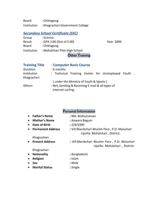This curriculum vitae provides information about Md.Rahij Uddin including his educational background, career objective, personal details, and training. He has a BBA in Management from Rangamati Government College with a CGPA of 2.8. His career objective is to work as a self-motivated person planning organizational procedures. Personal details include his permanent address in Manikchari Muslim Para, Khagrachari district, and that he is unmarried.