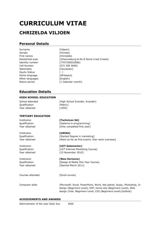 Chrizelda Viljoen is a Caucasian female from Johannesburg, South Africa. She has a matric qualification from High School Evander obtained in 1995. She has some tertiary education including a partially completed diploma in programming from Technicon SA and a started degree in marketing from UNISA. Her work experience includes positions in advertising such as Online Campaign Manager at The Mail & Guardian from 2010 to present and Senior Coordinator roles at The Mail & Guardian from 2006 to 2010 and The Daily Sun from 2003 to 2006. She has skills in Microsoft Office, Photoshop, and web design programs.