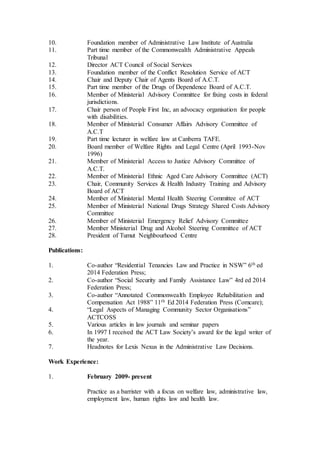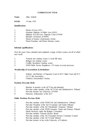 Allan Anforth's CV outlines his extensive qualifications and experience in law, including multiple masters degrees and positions held. He has worked as a barrister, lecturer, and member of numerous tribunals, focusing on areas like administrative law, welfare law, and human rights. The CV also lists his publications, awards, and over 40 years of experience in legal practice, education, and public service positions.
