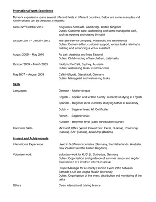 Laura Ewe is a multilingual and motivated business student seeking full-time employment. She has strong communication, presentation, computing, research, and teamwork skills. She holds a dual BSc in International Business from Anglia Ruskin University in the UK and Zuyd University in the Netherlands. Laura has work experience in customer service, project management, and childcare in Germany, the Netherlands, Australia, New Zealand and the UK. She is fluent in English and German with beginner proficiency in Spanish, Dutch, French and Russian.