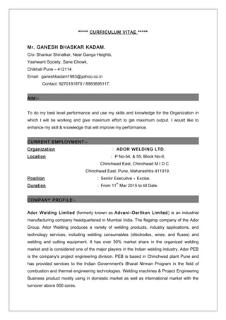 Mr. Ganesh Bhaskar Kadam has over 10 years of experience in excise, material management, and administrative roles. He is currently a Senior Executive - Excise at Ador Welding Ltd. in Pune, where he is responsible for excise documentation, cenvat credit claims, and monthly reporting. Previously he held excise and administrative positions at Metalex Cryogenics Ltd. and KSH International Pvt. Ltd. Mr. Kadam has a Bachelor's and Master's degree in Commerce.
