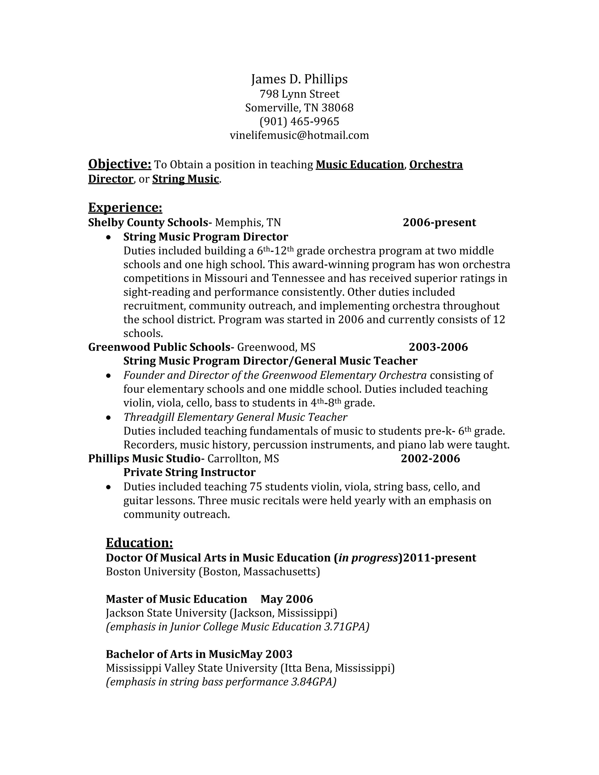 James D. Phillips is a music educator seeking a position teaching music education, orchestra director, or strings. He has over 15 years of experience building and directing award-winning orchestra programs in Tennessee and Mississippi schools. His background includes founding elementary orchestra programs and teaching general music. Phillips holds a Doctor of Musical Arts in Music Education and is licensed to teach in Tennessee and Mississippi.