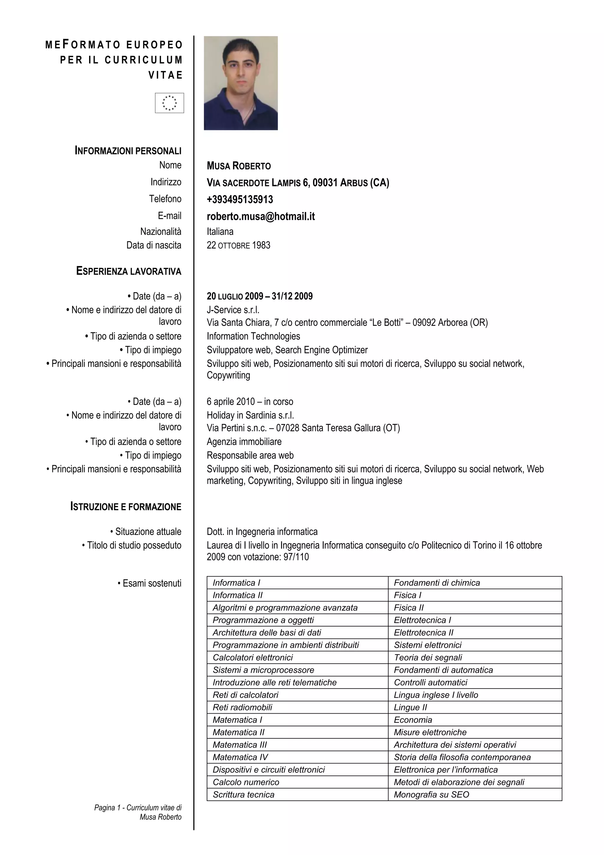 Roberto Musa è un esperto sviluppatore web e search engine optimizer con esperienza in aziende del settore IT e immobiliare. Possiede una laurea in ingegneria informatica e competenze in vari linguaggi di programmazione, come C, Java, e PHP, oltre alla conoscenza di sistemi operativi e DBMS. Ha lavorato a progetti di sviluppo e ottimizzazione SEO per diverse aziende e ha esperienze significative nel volontariato e nella gestione di attività educative.