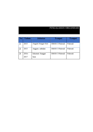 Curriculum vitae ini milik Nur Indah Sari, seorang perempuan kelahiran Polewali pada 9 Maret 1999. Saat ini, ia sedang menempuh pendidikan di Universitas Negeri Sulawesi Barat dan memiliki pengalaman organisasi di sanggar seni serta ambalan. Dia belum menikah dan bertempat tinggal di Polewali.