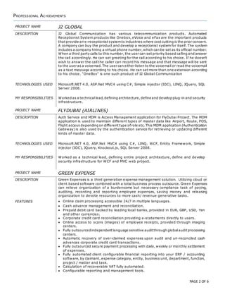The document is a comprehensive resume for Sandip Ghosh, a senior software engineer with over 9 years of experience in developing web-based applications. It outlines his technical skills in Microsoft .NET technologies, work history across various companies, and key projects such as J2 Global and Flydubai, highlighting his roles as a technical lead. Additionally, it includes educational background, professional achievements, and personal information.