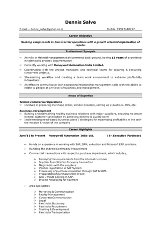 Dennis Salve has over 13 years of experience in commercial operations and procurement. He currently works as a Senior Executive for Honeywell Automation India, where he coordinates projects, streamlines workflows, and helps enhance profitability. He has a background in material management and holds an MBA. His career highlights include roles with Honeywell, Faurecia, Oerlikon Balzers, Mof Automation, and Montfort School.