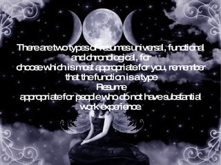 The document discusses different types of resumes and the information they should contain. A resume is a set of experiences used in job applications. There are two main types: chronological, listing jobs in reverse date order, and functional, focusing on skills over experience. A functional resume is best for those without much work history, while a chronological resume is standard for people with several years of experience. Both should include contact information, objectives or goals, experience or accomplishments, education, and optionally references.