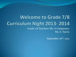 This document provides information about the Grade 7/8 teaching team, curriculum, homework policies, and supplies for the upcoming school year. It introduces the teachers and their subject areas. It outlines the homework policy, roles and responsibilities, and supplies needed. It provides an overview of the curriculum focus for term 1, including expectations in language, science, history, and math. It also includes sample culminating tasks and rubrics. Looking forward, information is provided about course selection and expectations for Grade 9.