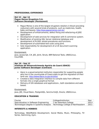 This document is a resume for Renam Sávio Pereira de Paula, an experienced software developer with over 4 years of experience successfully delivering complex IT systems. He has skills in languages like Java, C#, and Javascript and tools like JUnit, XML, Linux systems, and databases like MySQL. His professional experience includes roles at Pague Menos Drugstore S.A. as a software developer and at Instituto de Desenvolvimento Agrário do Ceará as a junior software developer.