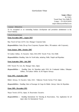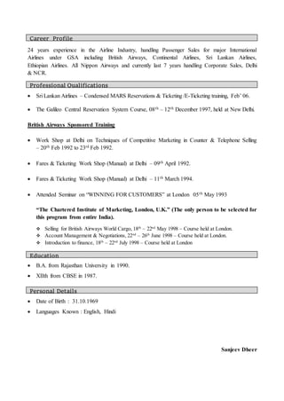 Sanjeev Dheer has over 24 years of experience in the airline industry handling sales for major international airlines in India. He has worked as the Manager of Corporate Sales for Riya Travel & Tours from 2007 to 2015 and prior to that held several sales roles for airlines like Sri Lankan Airlines, Continental Airlines, and British Airways. He has a Bachelor's degree from Rajasthan University and is fluent in English and Hindi.