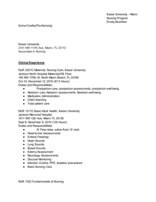 Emely Alcantara is seeking an Associate's Degree in Nursing from Keiser University. Her objective is to work as a pediatric nurse, obtaining experience and advancing her education to a BSN. She has certifications in BLS, OSHA and is a licensed practical nurse. Her clinical experience includes rotations in maternity, adult health and fundamentals of nursing. She has experience providing care in hospital and community settings.