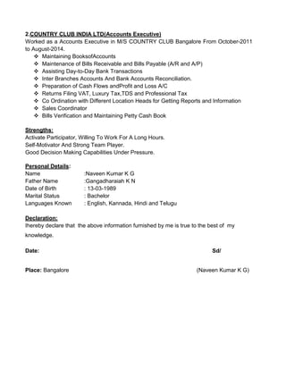 Naveen Kumar K G is seeking a position in finance, accounts, taxation, or management information systems where he can utilize his skills and experience. He has a M.Com degree from KSOU and technical skills in SAP, FOCUS ERP, LANPOS, and MS Office. Currently he works as a Financial Analyst at IBM India where he prepares journal entries, reports P&L, and trains new employees. Previously he was an Accounts Executive at Country Club India where he maintained accounts, assisted with bank transactions, and prepared cash flows and tax returns.