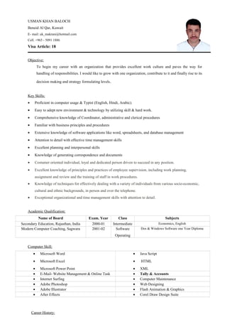 USMAN KHAN BALOCH is seeking a career opportunity with an excellent work culture where he can contribute and grow within the organization. He has over 15 years of experience in administration, customer service, graphic design, and project coordination. He is proficient in Microsoft Office, computer maintenance, web design, and several computer programs. He holds a diploma in computer operations and seeks to utilize his skills and dedication to succeed in any position.