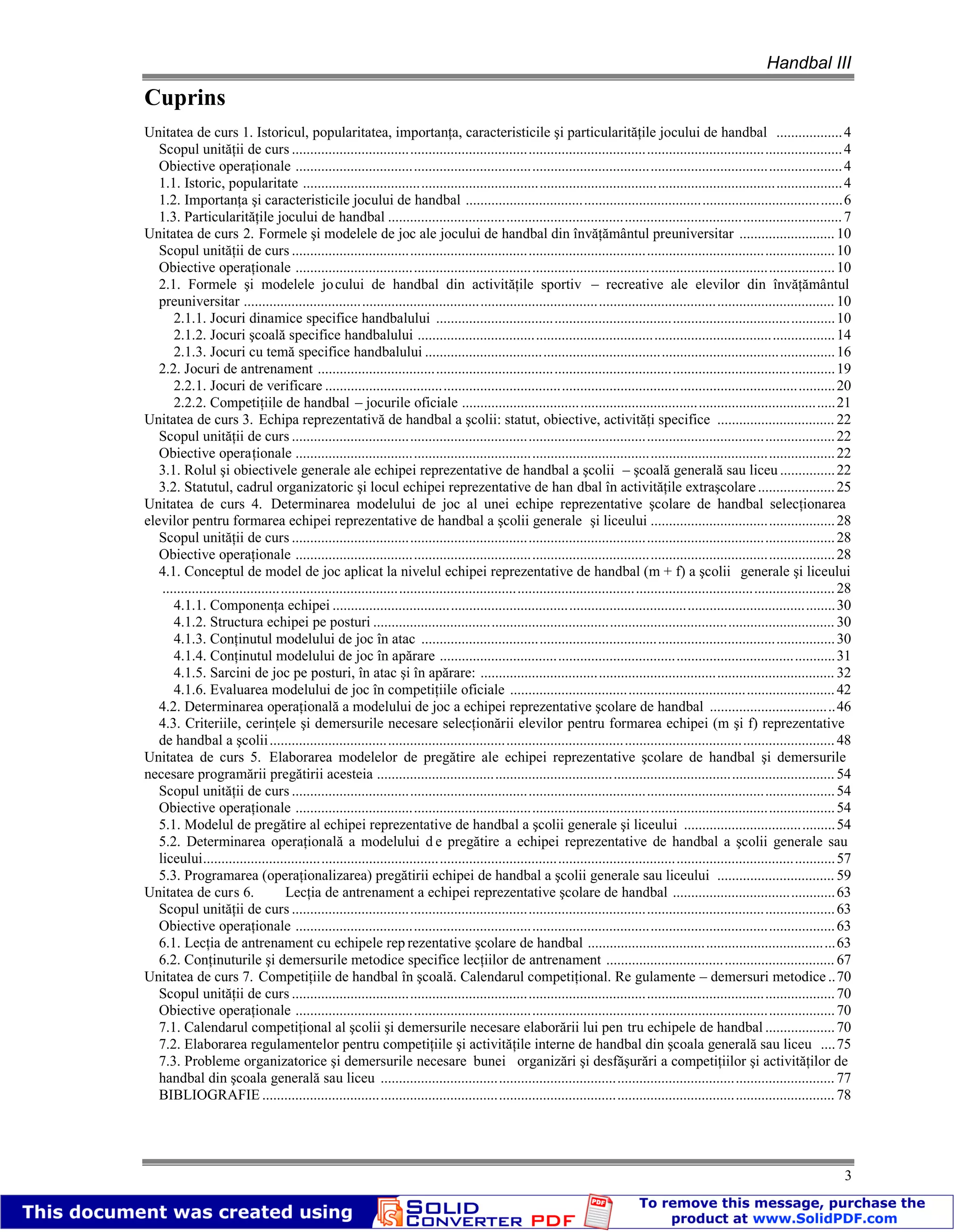 Documentul oferă un cuprins detaliat al unei unități de curs dedicată jocului de handbal, incluzând istoria, popularitatea, importanța și caracteristicile acestuia. De asemenea, se explorează formele și modelele de joc în învățământul preuniversitar, echipa reprezentativă de handbal a școlii, modelele de pregătire și competițiile de handbal. În ansamblu, documentul servește ca ghid asupra implementării și organizării handbalului în cadrul activităților educaționale.