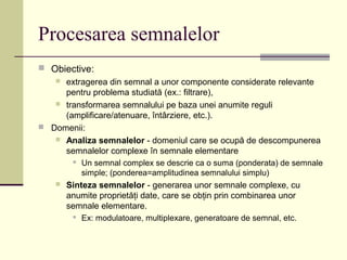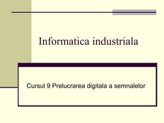 Cursul 9 de informatică industrială abordează procesarea semnalelor, inclusiv extragerea și transformarea componentelor semnalelor, clasificarea lor în funcție de predictibilitate, continuitate și amplitudine. Se discută despre analiza și sinteza semnalelor, sisteme liniare și neliniare, precum și despre transformatele Fourier pentru semnale periodice și aperiodice. De asemenea, sunt prezentate proprietățile transformatei Fourier și aplicabilitățile sale în evaluarea efectului sistemelor liniare asupra semnalelor complexe.