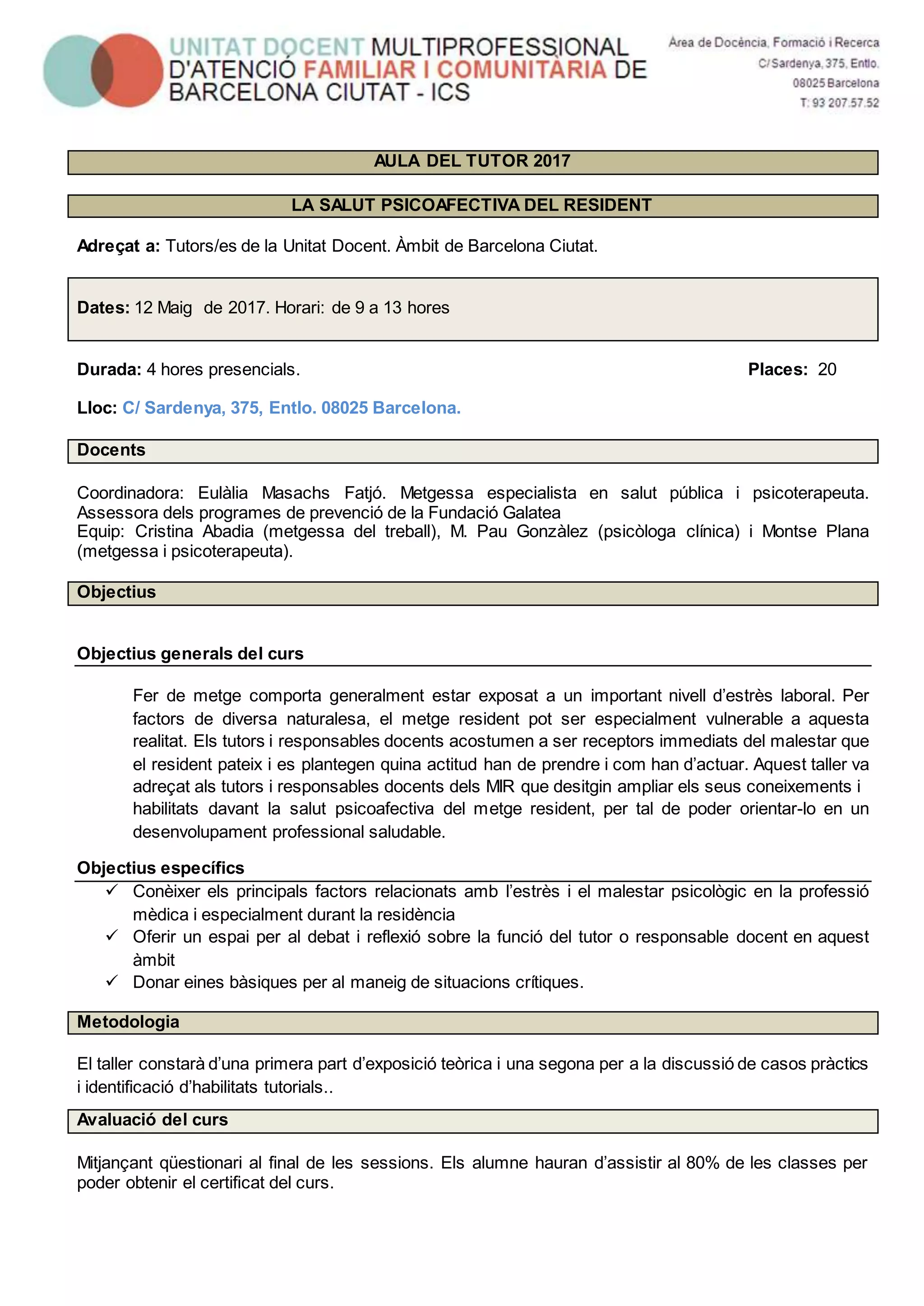 Adreçat a: Tutors/es de la Unitat Docent. Àmbit de Barcelona Ciutat.