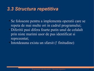 Documentul detaliază structura repetitivă în programare utilizată pentru a efectua operații repetate, inclusiv calcularea sumei cifrelor unui număr, a produsului cifrelor și a verificării primalității. Sunt oferite exemple de pseudocod și cod sursă C++ pentru diverse probleme, precum calcularea mediei numerelor introduse sau generarea sirurilor Fibonacci. De asemenea, se discută despre reprezentarea numerelor în calculator, transformarea numerelor din zecimal în binar și hexazecimal, utilizând atât algoritmi standard, cât și operații logice pe biți.
