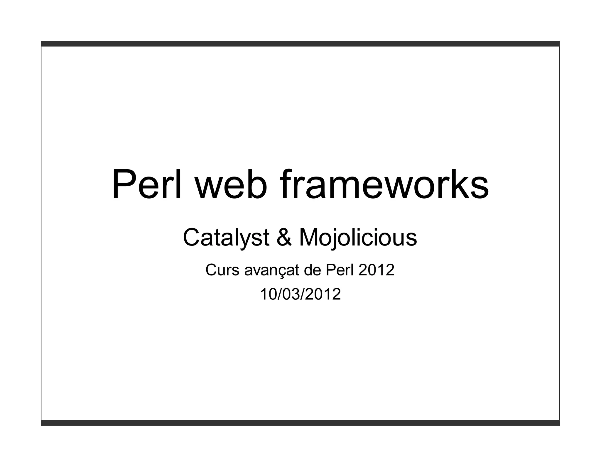 This document provides an overview of using Perl web frameworks Catalyst and Mojolicious. It discusses MVC architecture and components like routers, controllers, models, and views. It also covers installing frameworks via CPAN, creating Catalyst applications, adding controllers, views using Template Toolkit, and models using DBIC. Authentication and authorization plugins for Catalyst are also mentioned.