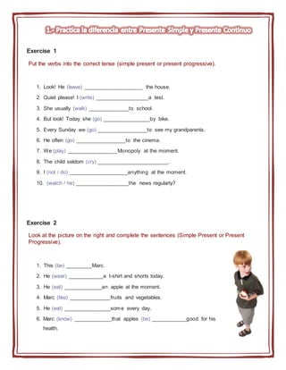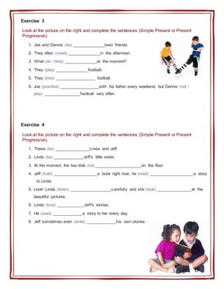 The document contains 6 exercises that provide examples of using the simple present and present progressive tenses in English. Exercise 1 gives examples of verbs in sentences that need to be changed to the correct tense. Exercises 2-5 provide pictures and sentences for the reader to fill in verbs in the simple present or present progressive tenses based on the pictures. Exercise 6 focuses specifically on changing verbs to the present progressive tense.