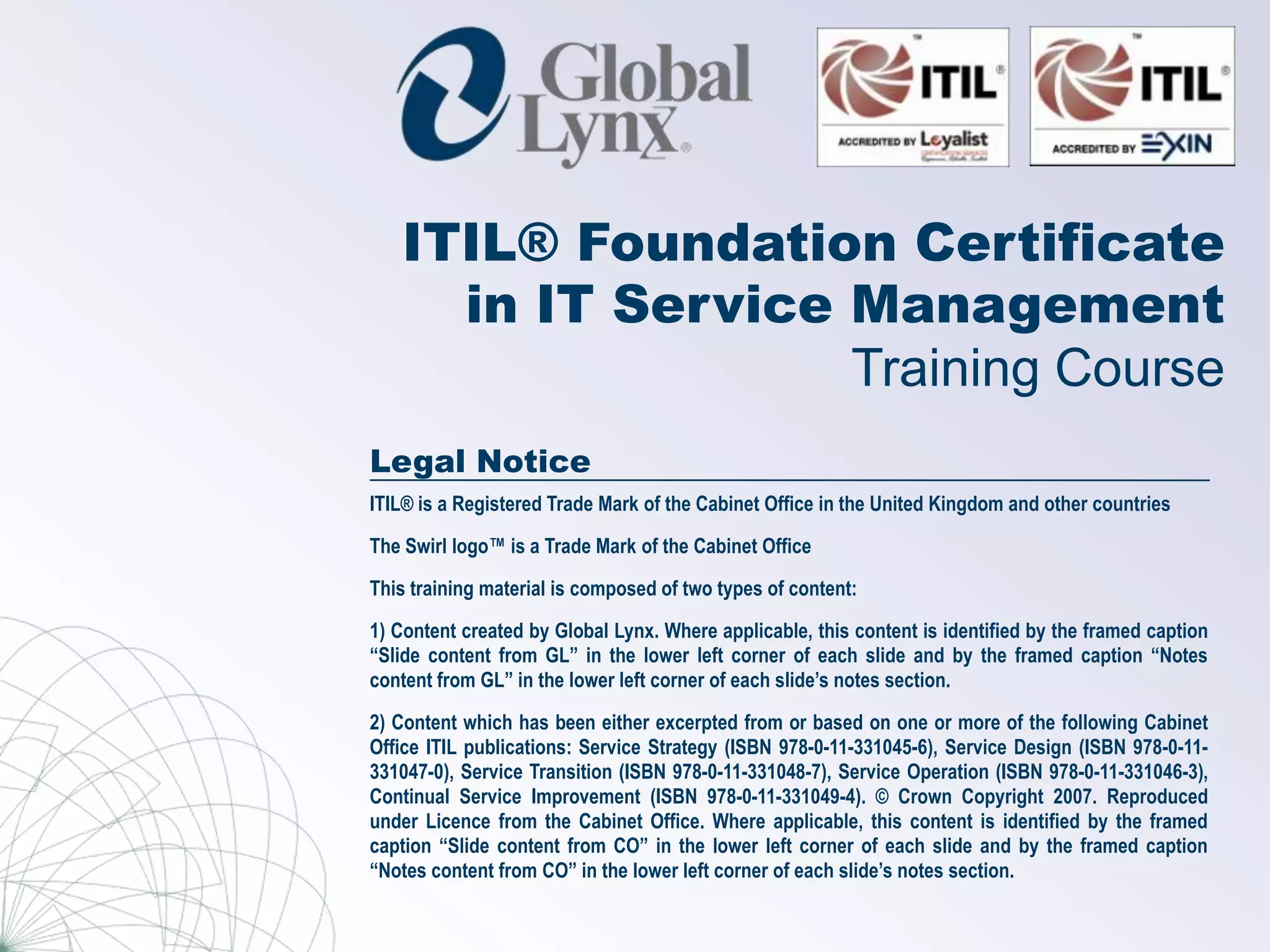 This document provides information about an ITIL Foundation Certificate training course, including: