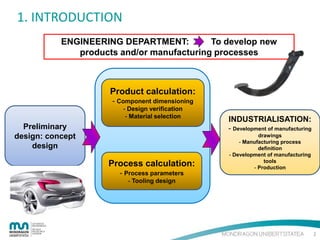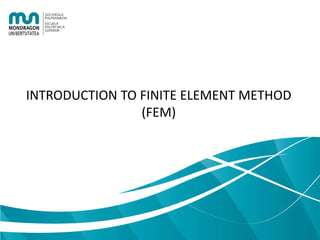 The document provides an introduction to the finite element method (FEM) for numerical analysis of engineering problems. It discusses how FEM can be used to solve complex problems by dividing them into smaller, simpler elements. FEM allows the use of computers to solve problems that cannot be solved through analytical methods. It also describes the different types of FEM formulations including implicit, which tries to obtain structural equilibrium at each time step for faster solutions, and explicit, which does not require iterations but has longer calculation times. Finally, the document gives examples of how FEM can be applied to problems in solid mechanics, fluid mechanics, and thermodynamics.