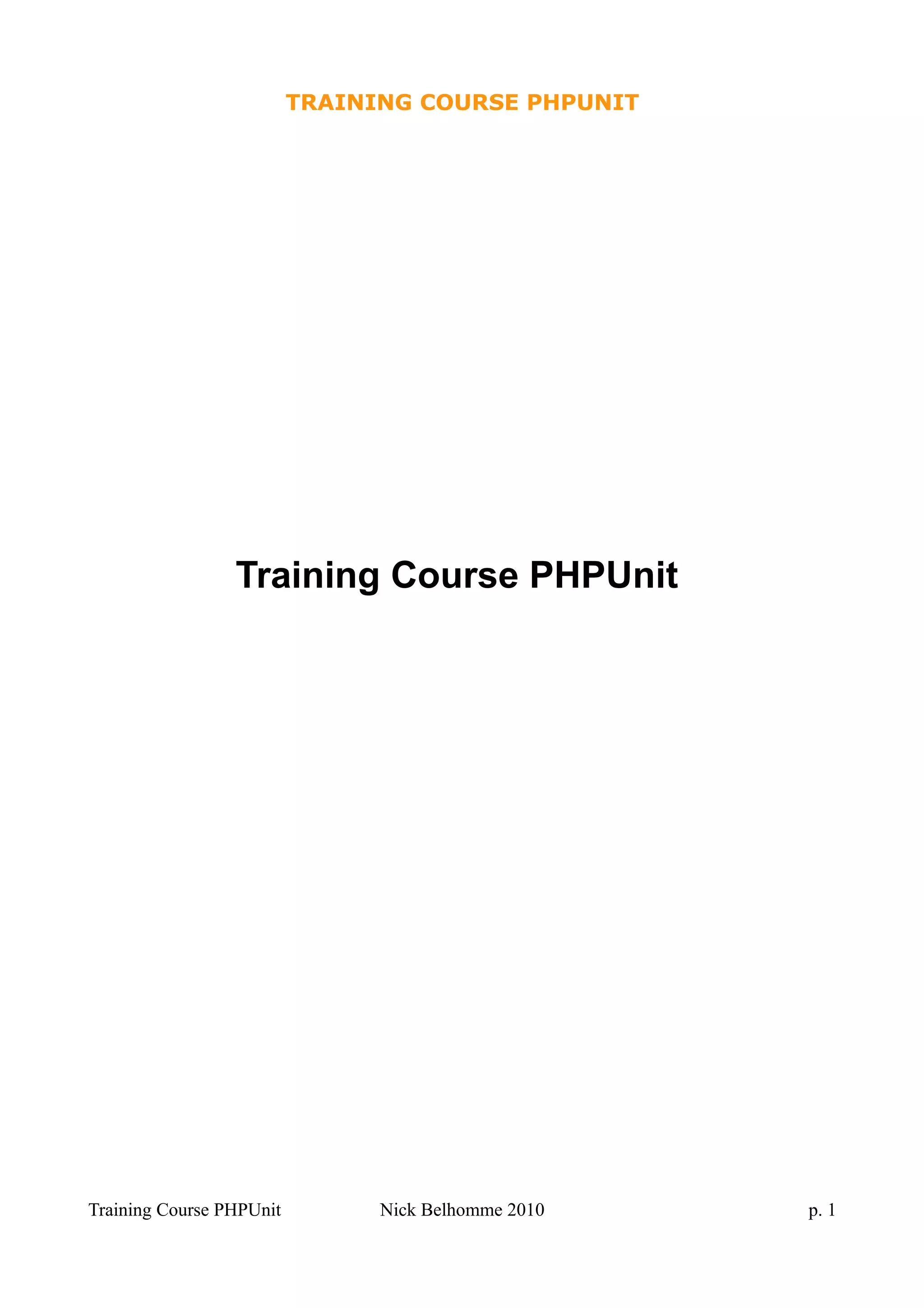 The document describes an introductory training course on PHPUnit testing. It discusses installing PHPUnit and getting started with writing tests. Specifically, it shows how to write a first test case to test a Game_Grid class by creating a GridTest.php file. It fails initially since the class doesn't exist yet. The test is then made to pass by creating the Grid class file. The document also discusses bootstrapping tests by creating a Bootstrap.php file to autoload classes so requires aren't needed in each test.