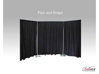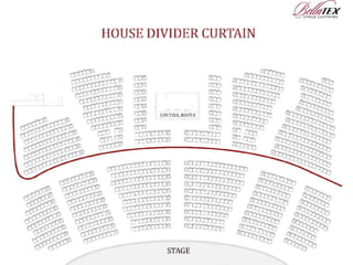 The document discusses different types of stage curtains used in theatre productions. It describes front curtains that hang behind the proscenium arch and open and close during performances. These can be single or double panels and open vertically or horizontally. Rear setting curtains include borders that hide lights above the stage, legs that hide off-stage areas, and intermediate draw curtains that divide the stage. Scrims and cycloramas are also discussed. The document also briefly mentions other curtain types like U-surround curtains for small stages, pipe and drape displays for temporary partitions, and house divider curtains used to split large spaces.