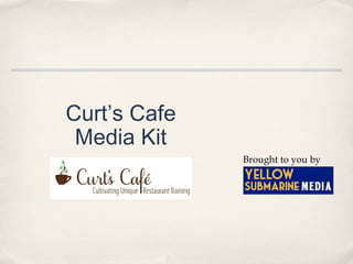 This document provides a media kit for Curt's Cafe that outlines their marketing and promotional strategy. It includes sections on brand analysis, SWOT analysis, competitive analysis, research analysis, target consumers, objectives, and proposed tactics across various channels. The key points are that Curt's Cafe aims to increase awareness among local realtors and families by 30-50% and communicate that customers come for the coffee and stay for the homey atmosphere. Tactics proposed include social media campaigns, print ads, online ads, email blasts, and events like a farmers market or 4th of July parade participation. The overall goal is to solidify Curt's as the welcoming neighborhood coffee shop in Evanston.