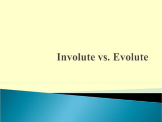The document discusses evolutes and involutes of curves. It defines an evolute as the locus of the centers of curvature of a curve, and an involute as a curve that is traced by a point on a taut string unwinding from the evolute. Specifically:
