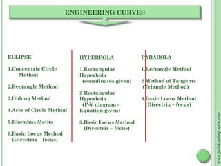 This document discusses different methods for drawing common engineering curves like ellipses, parabolas, and hyperbolas. It provides step-by-step instructions for drawing these curves using different geometric constructions including the concentric circle method, rectangle method, oblong method, arcs of circles method, and rhombus method. Examples are given for drawing each type of curve using these various techniques. Key properties of ellipses, parabolas, and hyperbolas as conic sections are also summarized.