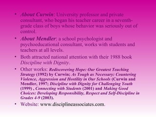 The document discusses the principles of 'Discipline with Dignity' by Richard Curwin and Allen Mendler, highlighting the importance of maintaining student dignity while providing hope and expectations for success. It outlines a three-dimensional discipline approach: prevention of misbehavior, actions to take when misbehavior occurs, and resolution strategies for chronic issues, emphasizing the need for teachers to adapt and maintain effective classroom management techniques. The document also addresses the issue of bullying and outlines effective strategies for educators to foster a supportive learning environment while promoting student self-control and responsibility.