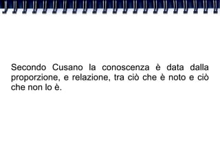 Niccolò Cusano sostiene che la conoscenza umana è limitata e si configura come 'dotta ignoranza', una continua ricerca di una verità perfetta irraggiungibile. Contestando il geocentrismo, lui afferma l'infinità dell'universo e dei mondi, suggerendo un rapporto profondo tra Dio e l'universo, dove entrambi si riflettono e interagiscono. Cusano propone che la mente umana, come Dio, è creatrice di conoscenza, stabilendo così un legame fondamentale tra la conoscenza matematica e la realtà divina.