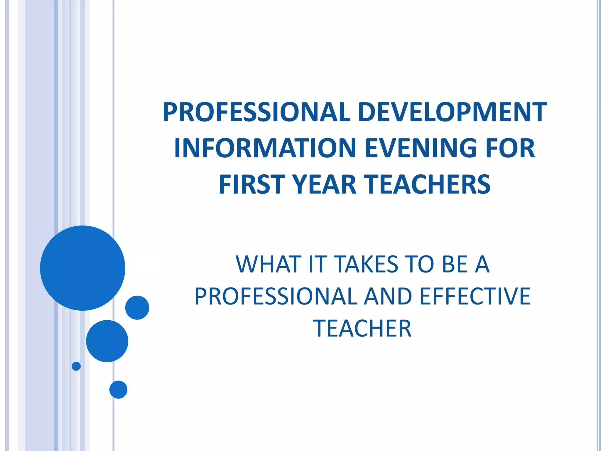 The document provides information from a professional development evening for first year teachers on what it takes to be an effective teacher. It discusses topics such as professionalism, commitment to students, specialized knowledge, Piaget's theory of intellectual development, decision making skills, and reflective practices. The summary emphasizes the importance of understanding child development, using knowledge to make informed decisions, and continually reflecting to improve teaching.