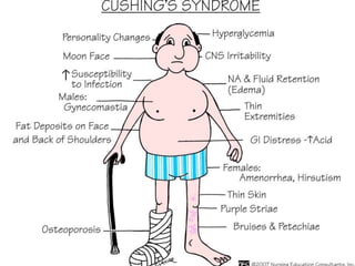 Cushing syndrome is characterized by excess cortisol secretion caused by too much ACTH from the pituitary gland or excess cortisol from adrenal tumors. It presents with weight gain, thin extremities, moon face, skin changes, and metabolic complications. Diagnosis involves urine and blood tests to measure cortisol levels. Treatment depends on the underlying cause but may include surgery to remove tumors, radiation therapy, or medications to reduce cortisol levels. Nursing care focuses on preventing infections, injuries, skin breakdown and improving nutrition, fluid balance and body image.