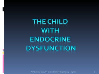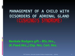 The document provides objectives and an overview of Cushing's syndrome, including its aetiology, pathophysiology, clinical manifestations, diagnosis, and nursing management. It aims to equip nursing students with knowledge of Cushing's syndrome and the management of a child presenting with the disorder through increased cortisol levels. A case study is presented to demonstrate nursing assessments and diagnoses for a teenage girl diagnosed with Cushing's syndrome.