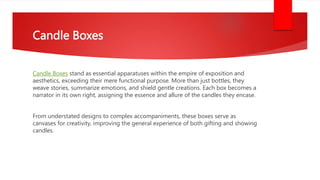 Candle boxes serve both functional and aesthetic purposes, acting as protectors and storytellers for the candles they encase. They enhance the gifting and showcasing experience through creative designs and branding, functioning as vital marketing tools. Their role extends beyond protection to include fostering consumer loyalty and attracting buyers.