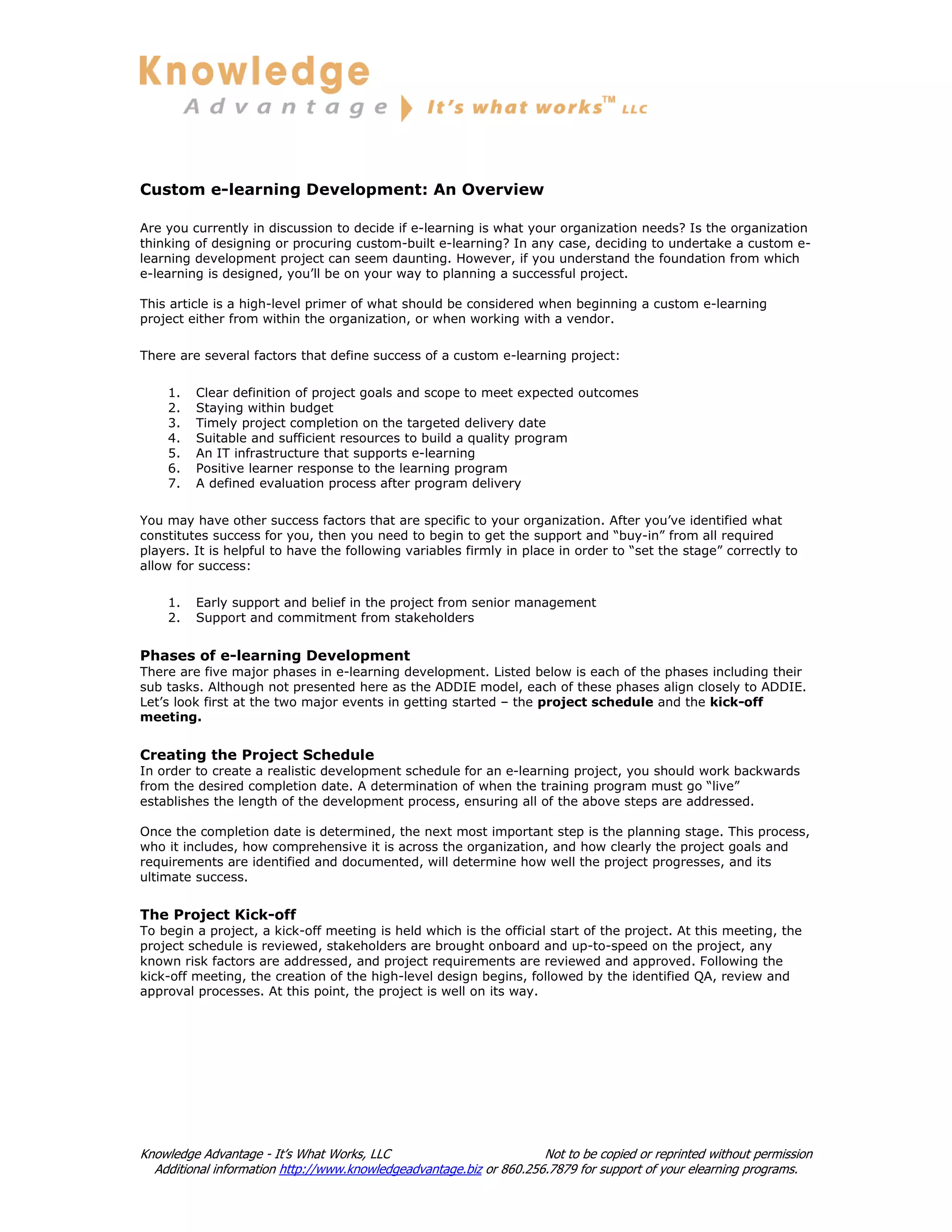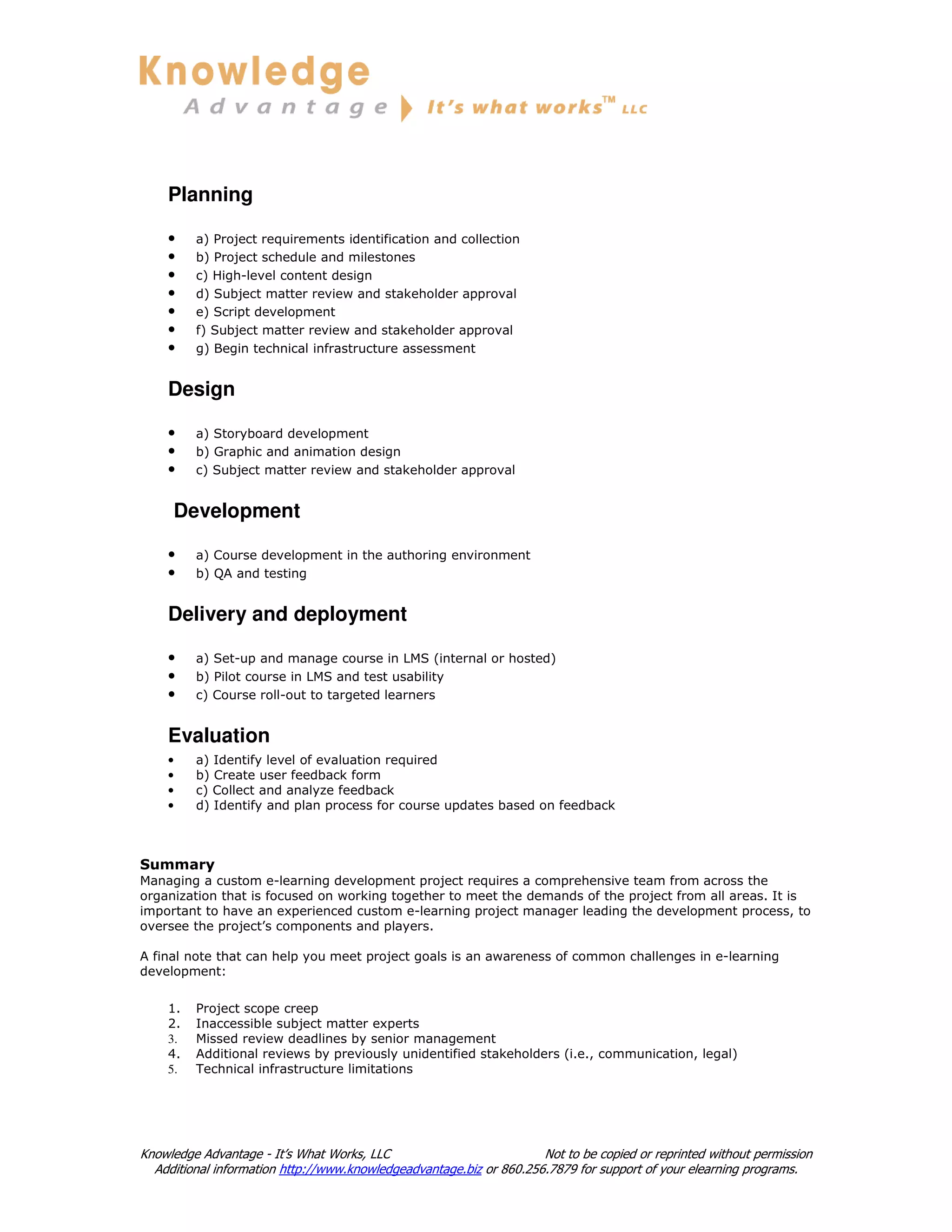 The document provides an overview of considerations for initiating a custom e-learning development project, emphasizing the importance of clear goals, budget adherence, and positive learner feedback for project success. It outlines five major phases of development: planning, design, development, delivery, and evaluation, along with essential tasks within each phase. Additionally, it highlights the need for strong support from senior management and stakeholders, as well as awareness of common development challenges.
