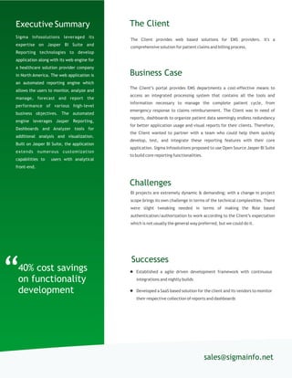 Sigma Infosolutions developed a comprehensive reporting application using the Jasper BI suite for a North American healthcare solution provider, improving patient claims and billing processes. The solution features automated reporting, dashboards, and real-time data management while achieving a 40% cost savings on functionality development. Future phases will focus on creating additional reports and data cubes for sub-organizations, further enhancing data accessibility for emergency medical services.