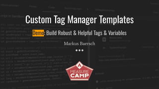 This document discusses custom tag manager templates, including why templates are useful, common community tags, and a demonstration of a data layer event repeater tag template. Templates allow for robust, helpful tags and variables to be built in a sandboxed, secure environment. A prototype is shown requiring only a few lines of code and no settings to add a tag, with debugging available through the console. The presentation encourages building custom templates and provides a link to a guide on single-page application tag management.