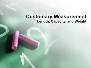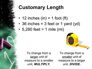 This document discusses customary units of measurement for length, capacity, and weight in the United States. It provides conversions between units like 12 inches in a foot, 4 quarts in a gallon, and 16 ounces in a pound. Examples are given for estimating distances like a mile being half the length of a racetrack or weights like a bag of coffee weighing about 1 pound. Conversions involve multiplying to change to a smaller unit or dividing to change to a larger unit.